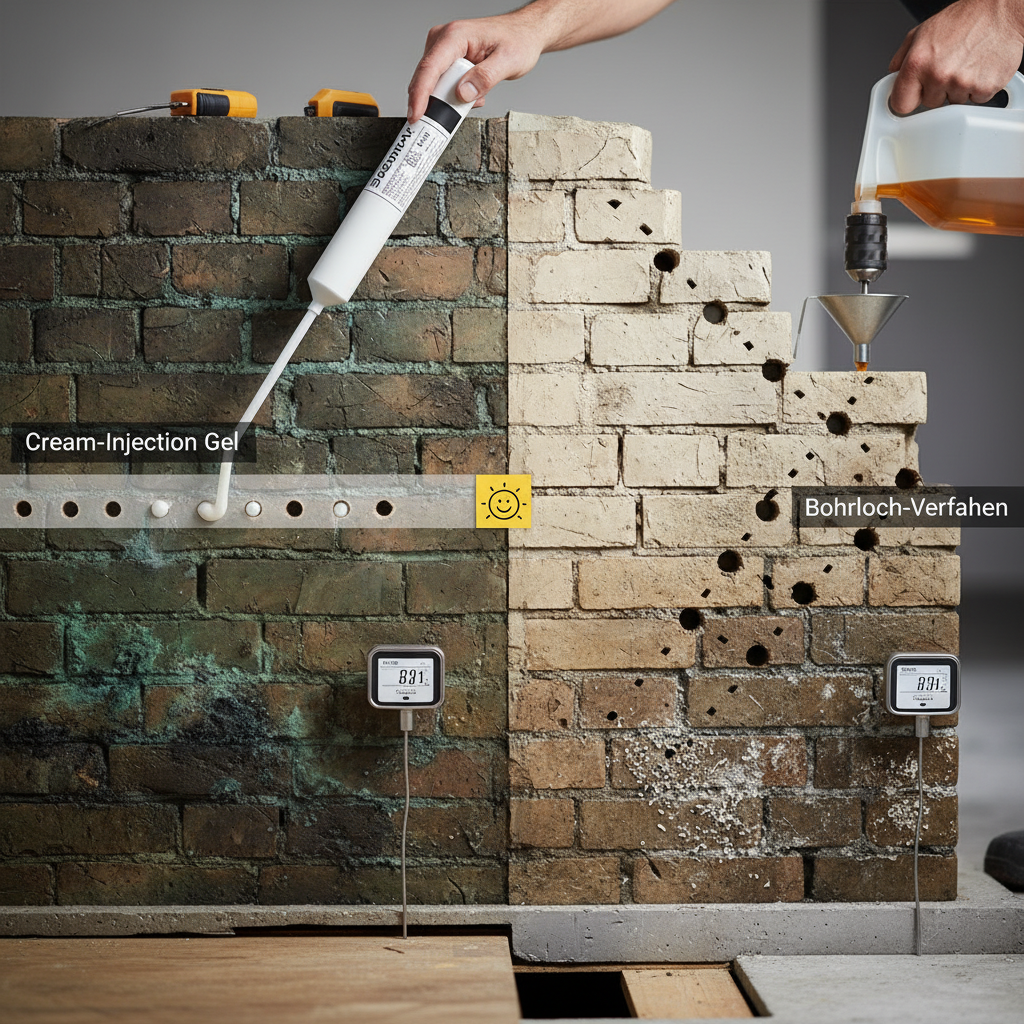 Aufsteigende Feuchtigkeit stoppen: Cream-Injektion Gel oder Bohrloch-Verfahren?